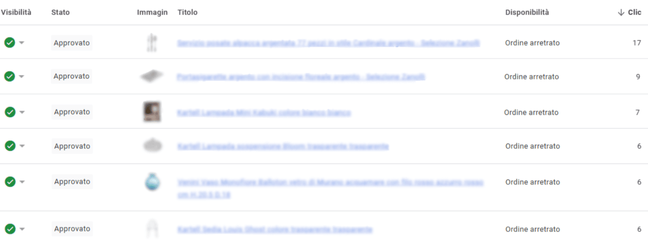 Esempio di prodotti in backorder nel Merchant Center, con evidenza del numero di clic.