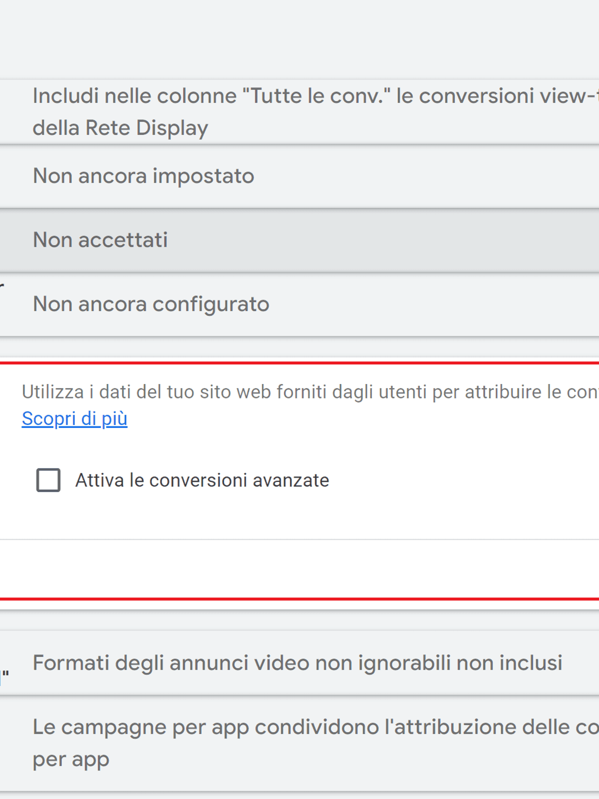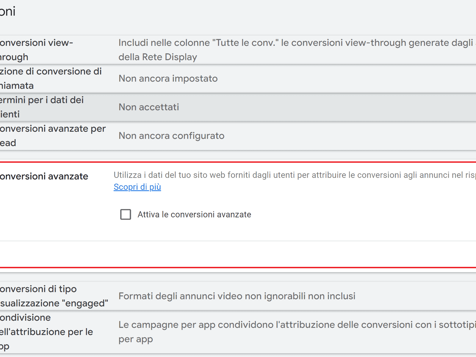 Le conversioni avanzate vanno attivate innanzitutto nell’account Google Ads, sezione Obiettivi → Impostazioni. Seleziona il metodo di configurazione e conferma.