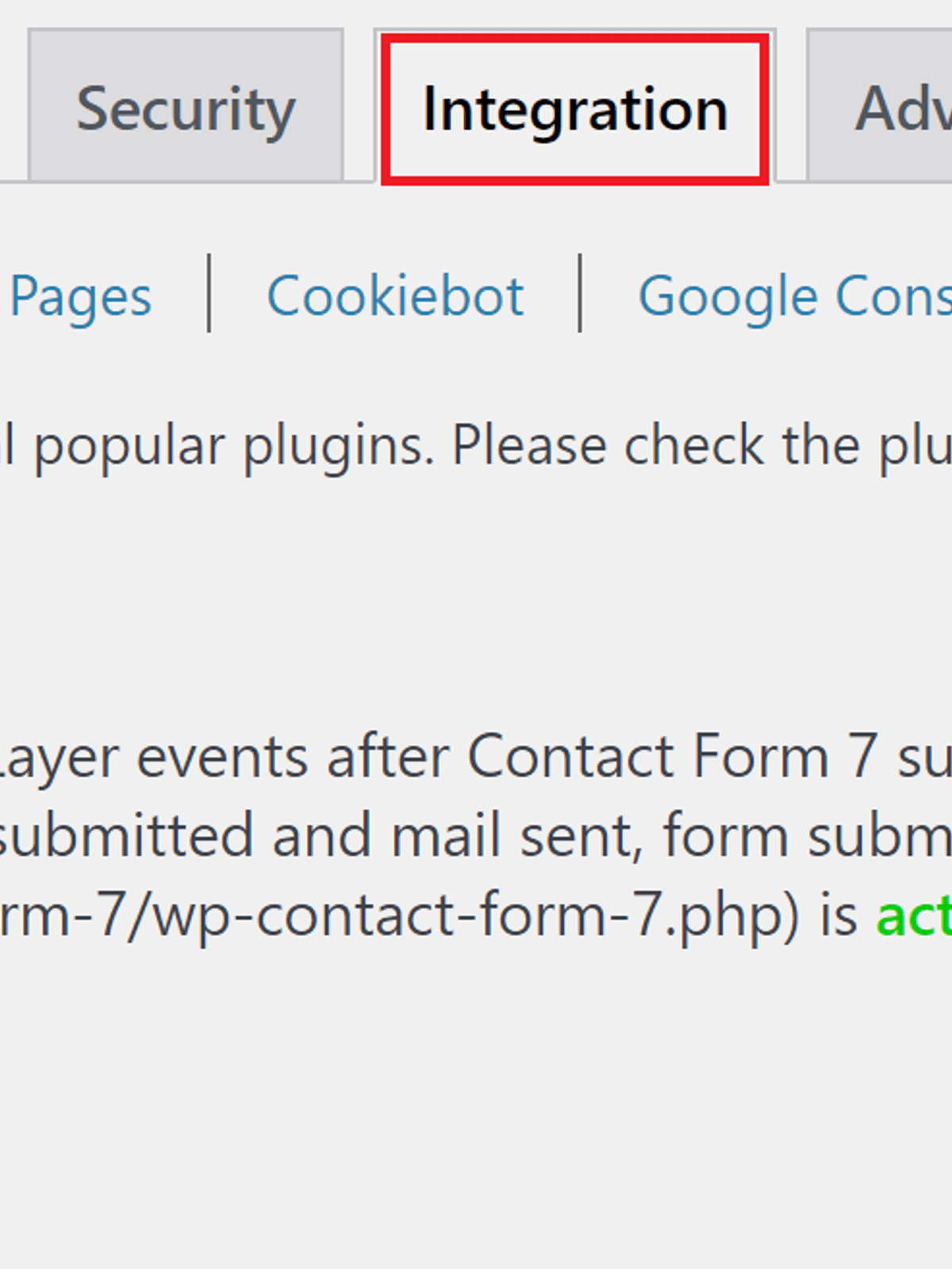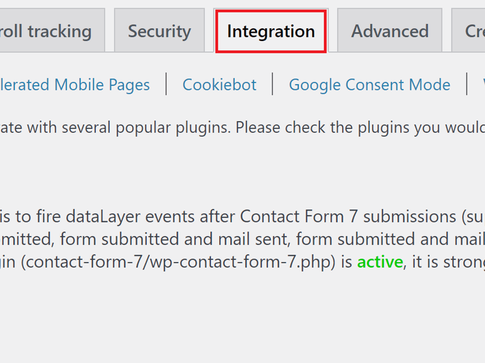 Nel caso sul sito siano presenti anche form gestiti tramite Contact Form 7, sempre nelle Impostazioni di GTM verifica che sia flaggata l’integrazione che consente la pushata degli eventi relativi alle compilazioni dei form.