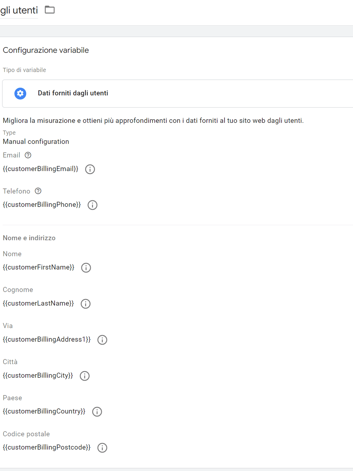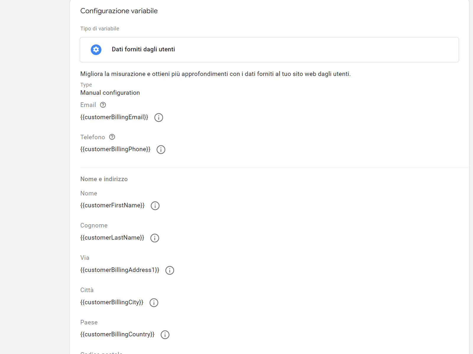 Una volta create le variabili, crea una variabile di tipo Dati forniti dagli utenti. Tipologia di configurazione: manuale. A questo punto non resta che selezionare la variabile che hai creato per ogni dato tracciabile.