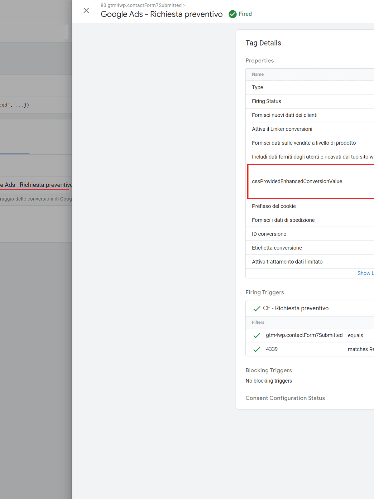 Per completare l’implementazione delle conversioni avanzate, manca un ultimo passaggio: flagga nei tag di Monitoraggio delle conversioni di Google Ads la voce “Includi dati forniti dagli utenti e ricavati dal tuo sito web” e seleziona la variabile contenente i dati forniti dagli utenti.