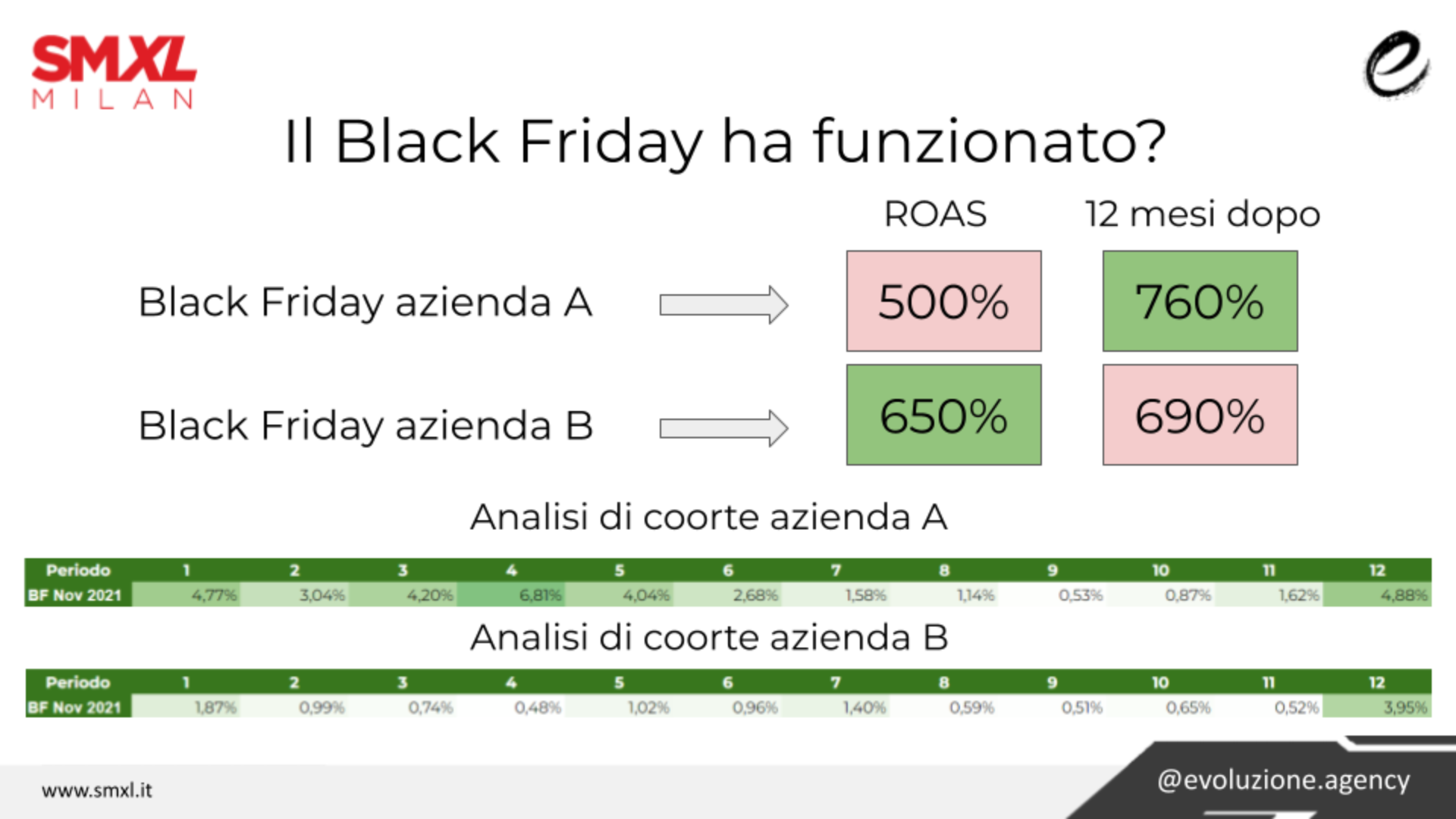 Nell’esempio qui proposto, la valutazione istintiva sul breve termine delle campagne Black Friday dell’azienda B sembra migliore rispetto a quella dell’azienda A. Eppure, allargando il focus e utilizzando l’analisi di coorte, scopriamo che l’azienda B ha acquisito clienti poco fedeli, fortemente attratti solo dalla scontistica, mentre l’azienda A ha trovato clienti ad alto LTV vincendo quindi la gara sulla lunga distanza. Nel caso di iniziative come il Black Friday è ormai fondamentale non limitarsi a valutare il ROAS, ma spostare il focus sul LTV:CAC, ovvero il rapporto tra il Customer Lifetime Value e il costo di acquisizione.