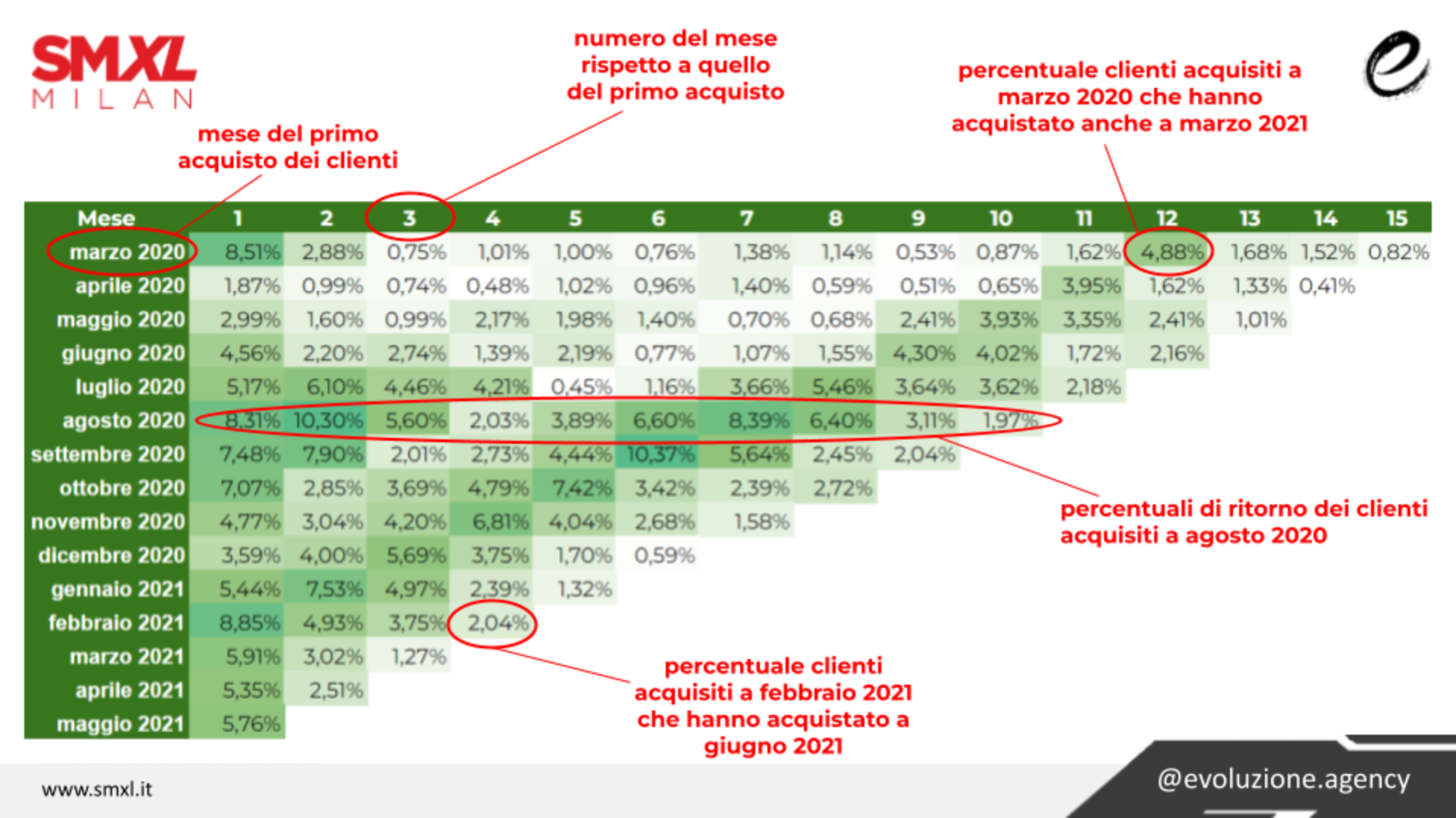 L’esempio classico di cohort analysis applicata a un ecommerce è la matrice che segmenta gli utenti in coorti basate sul mese di acquisizione e osserva il loro comportamento nei mesi successivi. Possiamo così osservare quale è la percentuale di ritorno dei clienti sul lungo termine e valutare il rendimento di ciascuna coorte. Le opportunità offerte da questa metodologia sono molteplici: