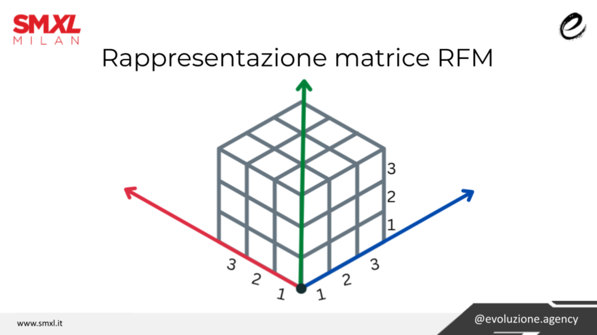 Per rappresentare la matrice RFM occorrono 3 dimensioni , perciò la figura perfetta è il cubo. I tre assi fanno riferimento ai valori dei 3 pilastri RFM e in base al punteggio i clienti si posizionano all’interno del cubo. Costruire l’analisi RFM può sembrare complesso a prima vista, ma basta seguire alcuni semplici passaggi e si può ottenere una perfetta segmentazione: