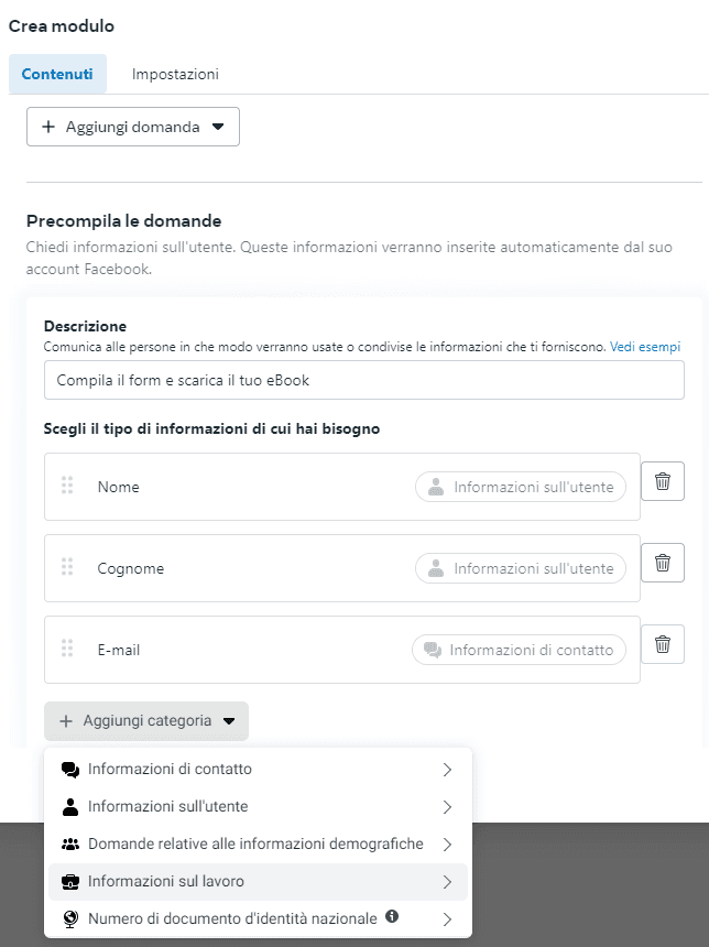 Attraverso un modulo di contatto interattivo che è possibile creare velocemente all’interno della piattaforma potrai infatti richiedere all’utente non solo i suoi dati di base come nome, cognome e indirizzo mail, ma aggiungere anche dettagli aggiuntivi o domande personalizzate. Questo form può essere creato in pochi minuti sia tramite Business Suite che direttamente all’interno di Gestione Inserzioni, facendo risparmiare tempo utile che può essere investito nell’elaborazione di contenuti grafici e senza la necessità di coinvolgere un frontender.