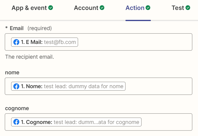 9. Effettuare il Test proposto da Zapier e verificare che il contatto di test “test@fb.com” arrivi in piattaforma nella lista o nel gruppo corretto e con tutti i campi corrispondenti a quelli di test generati in Zapier