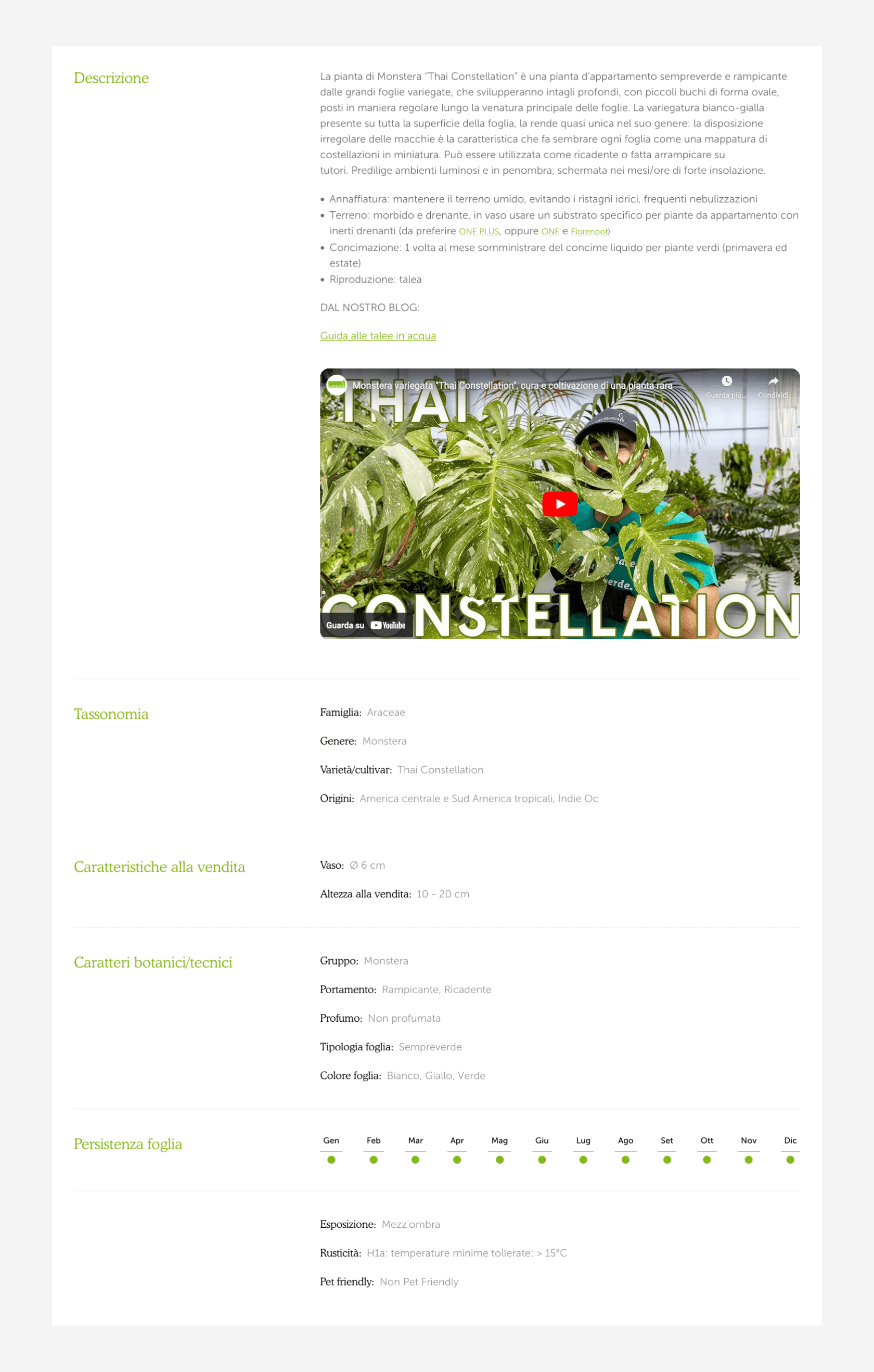 Esempio di dati tecnici di una pianta dell’eCommerce venditapianteonline.it