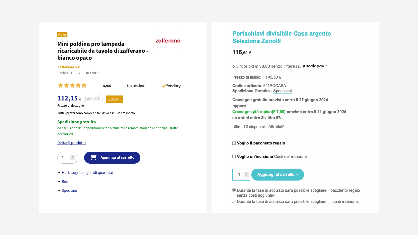 • Opzioni di consegna: mostrare chiaramente le opzioni di consegna disponibili, comprese le tempistiche e i relativi costi. Queste informazioni possono essere presentate in una sezione espandibile, permettendo agli utenti di accedere facilmente ai dettagli senza sovraccaricare visivamente la pagina.