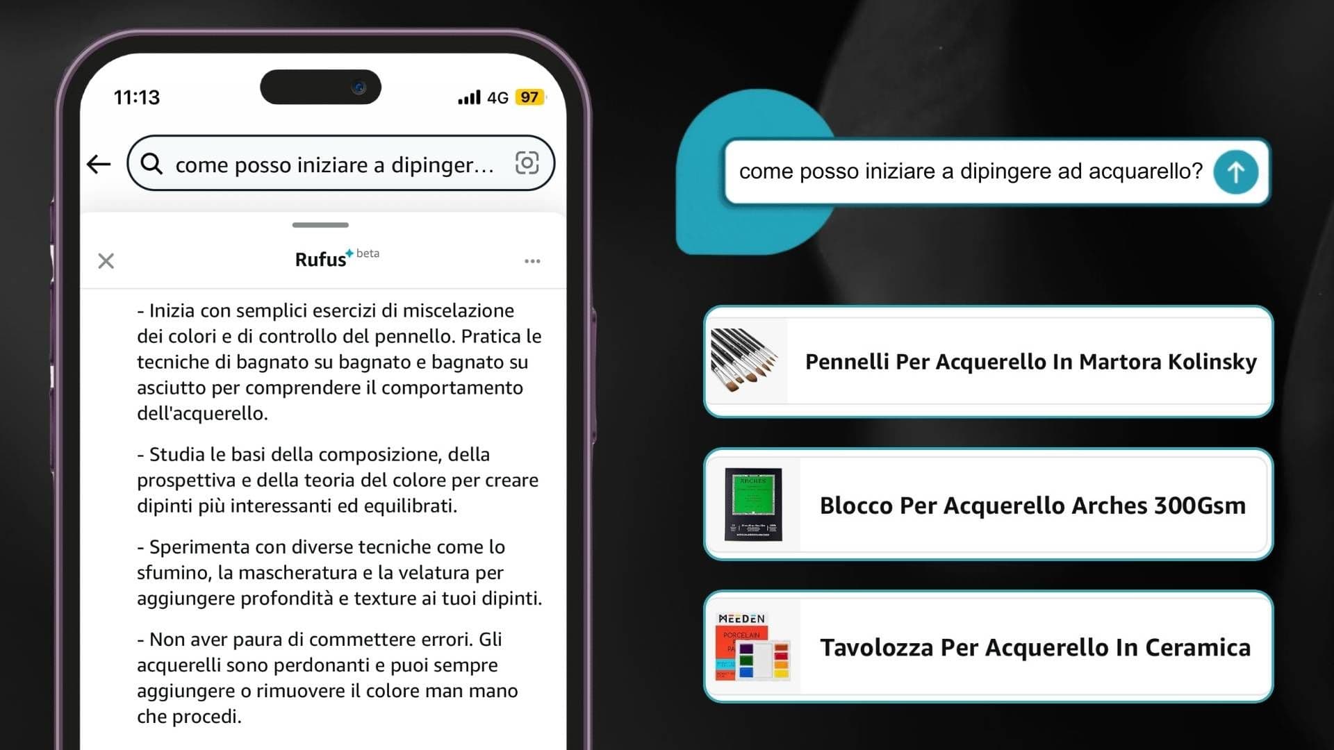 Se un cliente ha la necessità di acquistare prodotti per un evento particolare o un’attività specifica, può chiedere a Rufus, per esempio: “Cosa serve per organizzare una cena all’aperto?” o “Come posso iniziare a dipingere ad acquerello?”. L’assistente suggerirà articoli utili, come tavoli pieghevoli, luci da esterno, o set di pennelli e colori, guidando passo dopo passo nella preparazione di ciò che serve.