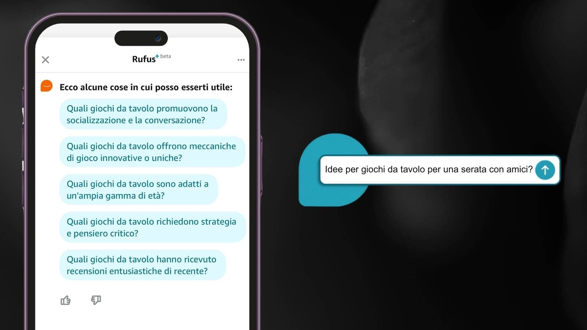 Rufus è un esperto nel suggerire prodotti in base alle necessità del cliente. Ad esempio, chiedendo: “Un regalo unico per un appassionato di cucina?” o “Idee per giochi da tavolo per una serata con amici?”. Rufus fornirà alcune proposte, come gadget da cucina innovativi oppure potrebbe cercare di indirizzare meglio l’utente inducendolo a fare una domanda più specifica per fornire consigli più mirati.