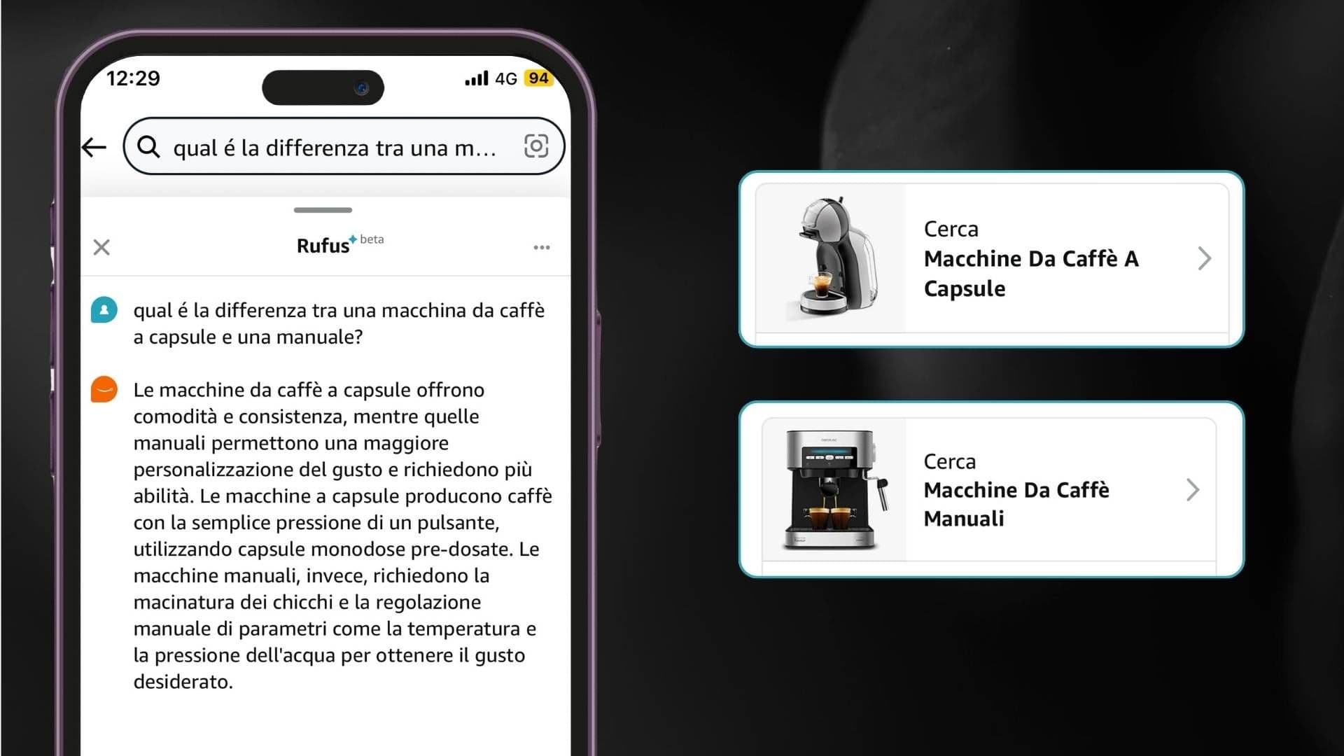Nel caso in cui il cliente fosse indeciso tra due articoli, Rufus si rende perfetto anche per le comparazioni rapide. È possibile chiedere: “Qual è la differenza tra una macchina da caffè a capsule e una manuale?” o “Quale monitor è migliore per il gaming?”. Rufus analizza le caratteristiche chiave di ciascun prodotto per aiutarti a prendere decisioni informate.