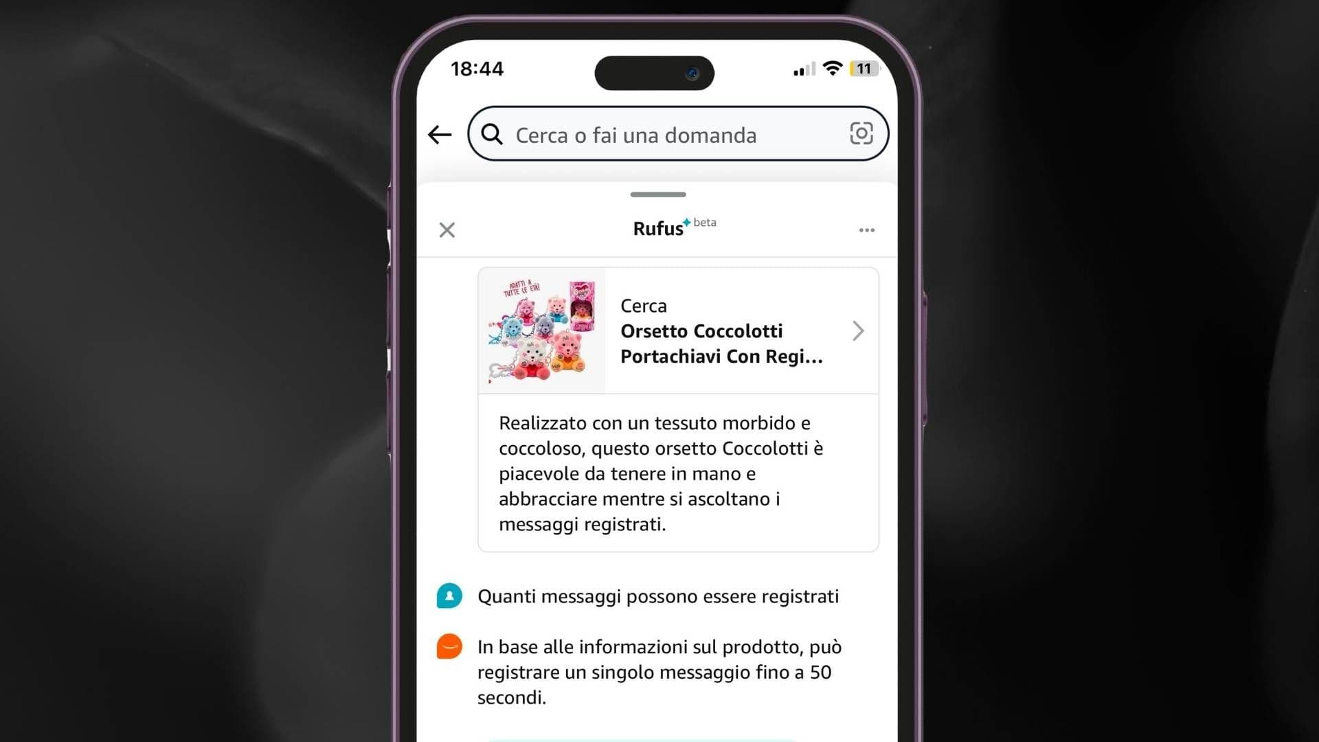 Come già accennato, è possibile interagire con Rufus dall’app mobile (l’assistente non è ancora disponibile sul sito web di Amazon in Italia). Rufus compare sia come chatbot in un pop-up di chat che si apre dopo aver effettuato la richiesta tramite la barra di ricerca “classica” all’interno dell’app, sia come assistente che può essere interpellato dall’utente direttamente nelle pagine dei prodotti, toccando l’icona dedicata a Rufus che si trova nella parte inferiore della schermata, a destra nella TabBar. Nonostante questa doppia possibilità, lo storico della conversazione rimane all’interno della medesima chat.