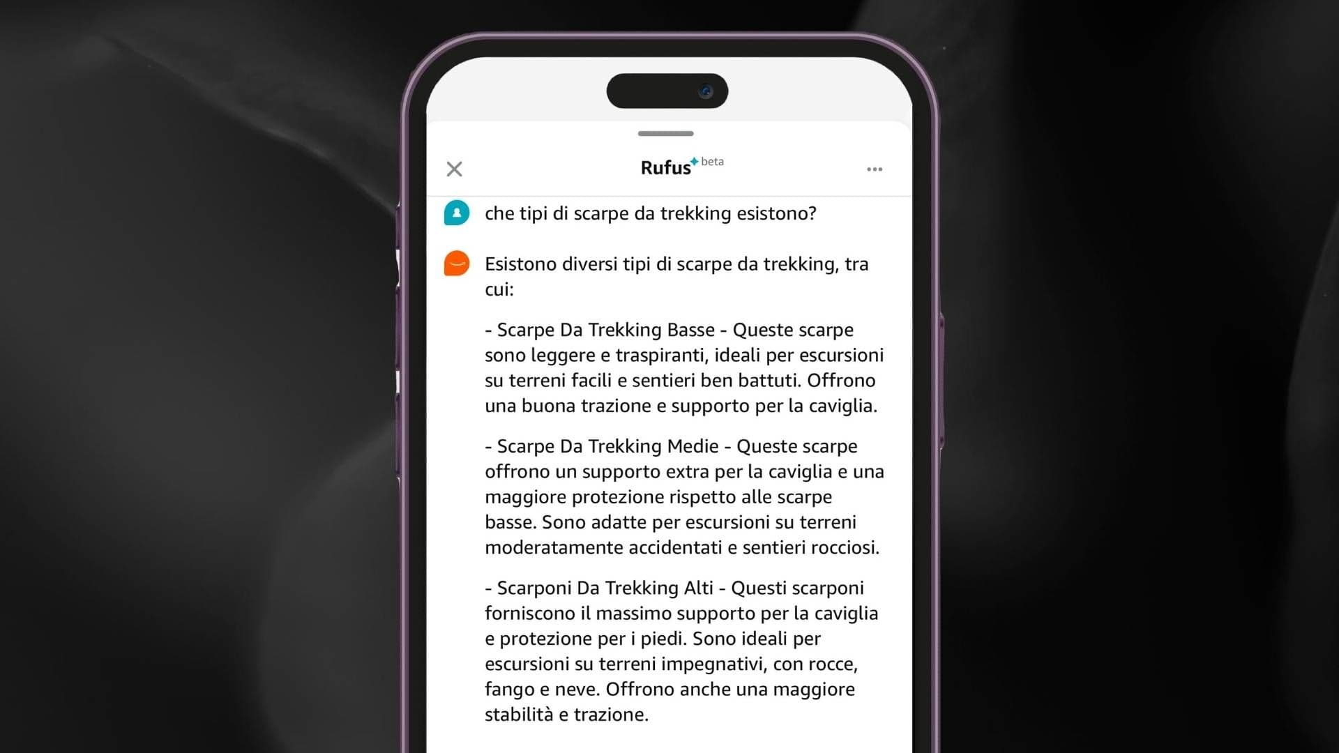 Se il cliente non sa da dove iniziare, Rufus lo aiuta a scoprire le diverse opzioni in una categoria specifica. Si può chiedere, ad esempio, “Quali sono le tipologie di aspirapolvere?” o “Che tipi di scarpe da trekking esistono?”. Rufus fornisce una panoramica chiara per orientare meglio nella scelta e aiutare a trovare il prodotto giusto, rendendo più semplice il percorso d’acquisto.